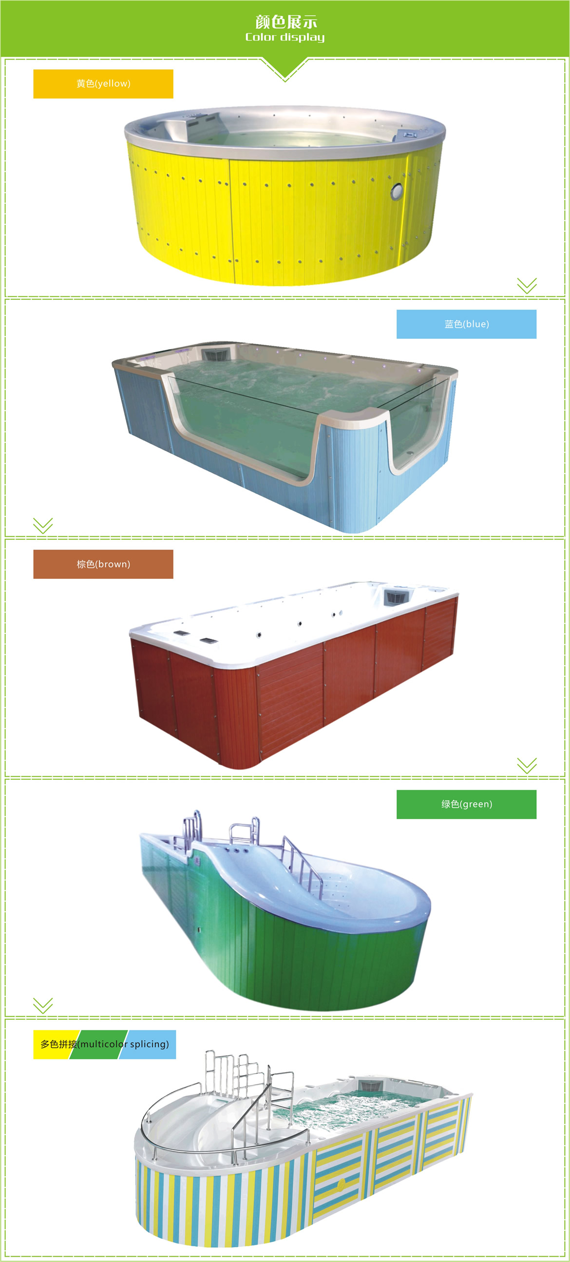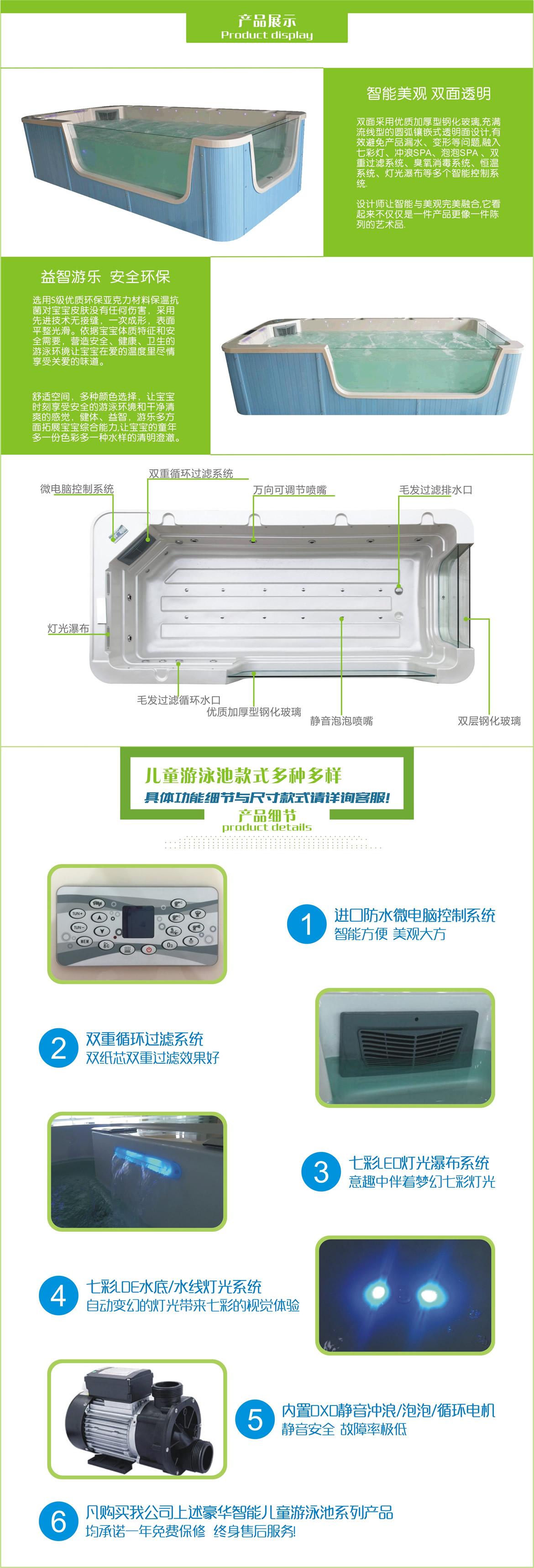 进口亚克力一次成型,内置微电脑控制系统、双过滤系统、热恒温、臭氧消毒、 冲浪SPA、泡泡水疗、七彩LED灯、灯光瀑布、收音机等智能豪华功能,外围采 用进口环保芬兰木裙边
